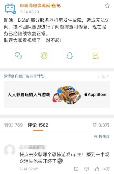 为何崩了?7月14日凌晨2时20分,B站发布公告解释:昨晚,B站的部分服务器机房发生故障,造成无法访问。技术团队随即进行了问题排查和修复,现在服务已经陆续恢复正常。
