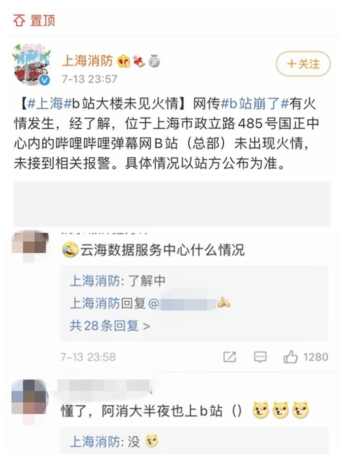 但很快,上海消防13日晚间发布消息称,网传B站崩了有火情发生,经了解,位于上海市政立路485号国正中心内的哔哩哔哩弹幕网B站(总部)未出现火情,未接到相关报警。