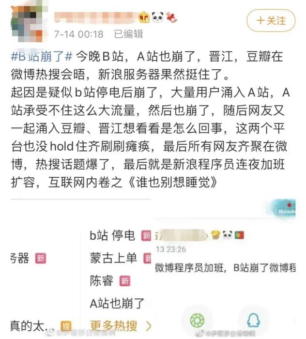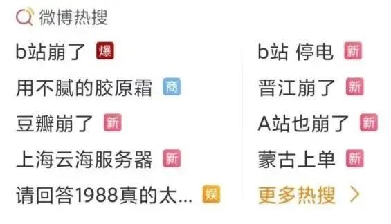 此外,有网友认为,起因是疑似B站停电后崩了,大量用户涌入A站,A站承受不住这么大流量,然后也崩了,随后网友又一起涌入豆瓣、晋江想看看是怎么回事,这两个平台也没hold住齐刷刷瘫痪。